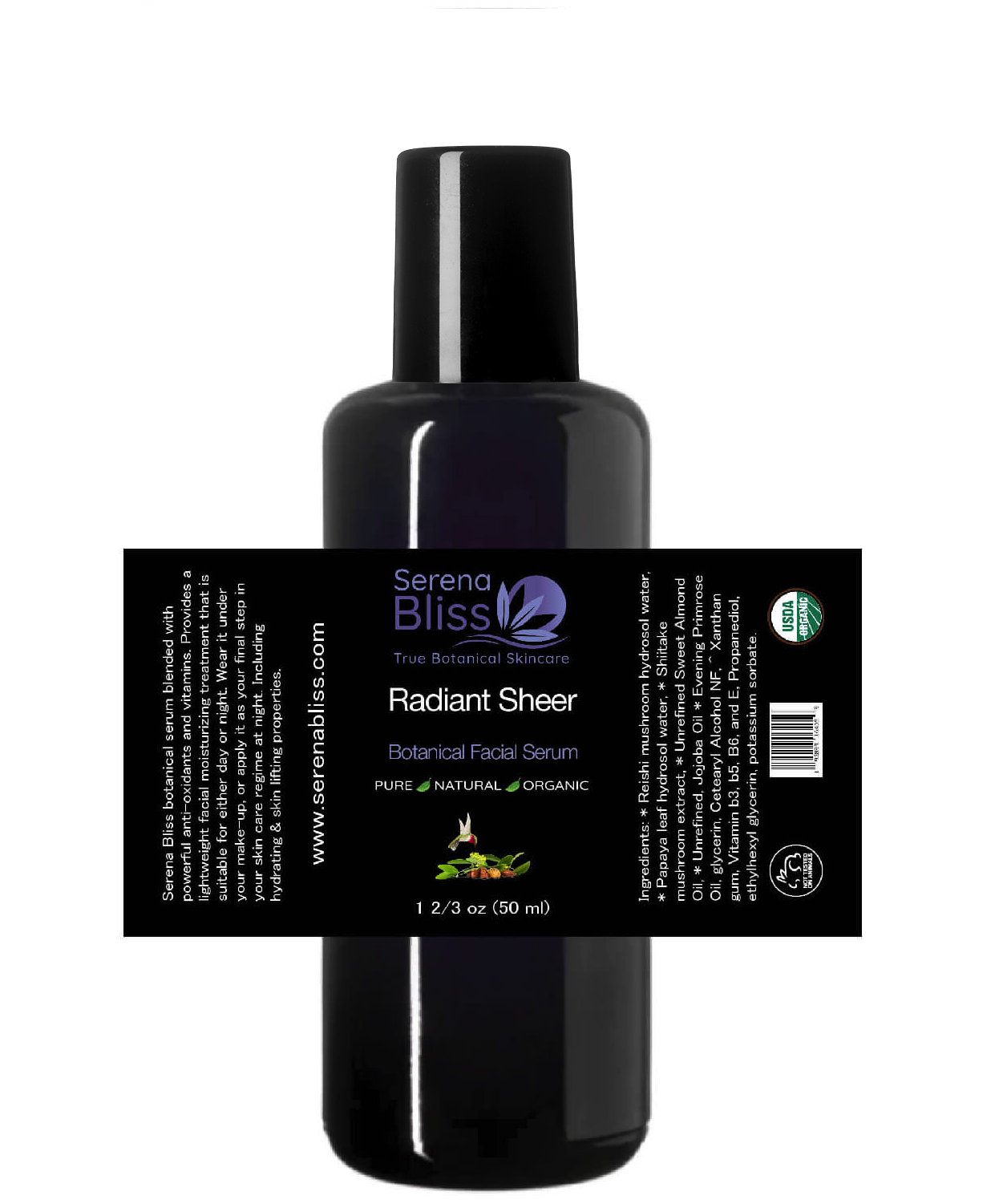 Description: Serena Bliss botanical serum blended with powerful anti-oxidants and vitamins. Provides a lightweight facial moisturizing treatment that is suitable for either day or night. Wear it under your make-up, or apply it as your final step in your skin care regime at night. No matter how you chose to use it, our carefully selected ingredients will leave your skin soft and supple feeling.